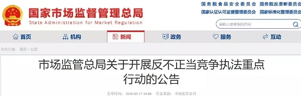 国家市场监督管理总局于517日发布《关于开展反不正当竞争执法重点行动的公告〔2018年第4号〕》。此次反不正当竞争行动时间从5月开始,持续到10月。公告中,列出了本次行动重点打击问题,旨在切实加强社会监督和共治,维护市场公平竞争的秩序。