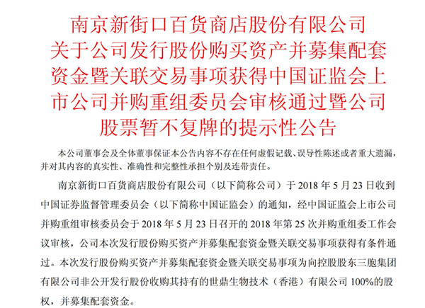 523日,对南京新百来说是历史性的一天。从去年11月披露收购预案到今天,历时半年,南京新百终于获得了证监会上市公司并购重组审核委员会审核通过,将FDA批准的首个细胞免疫治疗药物纳入麾下。