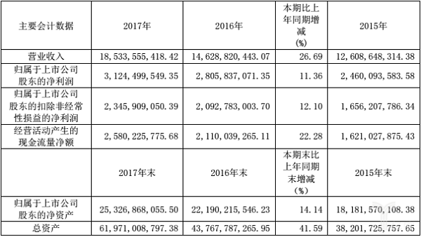 5月23日,复星医药披露了2017年年度报告。报告显示,公司2017年营业收入约为185.34亿元,较上年同期增长26.69%;归属于上市公司股东的净利润约为31.24亿元,较上年同期增长11.36%。具体数据参照下表: