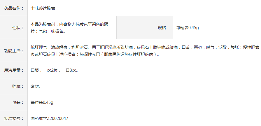作为国内独家品种、国家级四类新药、西藏药业荣誉出品,十味蒂达胶囊在疏肝理气、利胆溶石方面效果优异,常被用于缓解肝胆湿热所导致的胁痛。